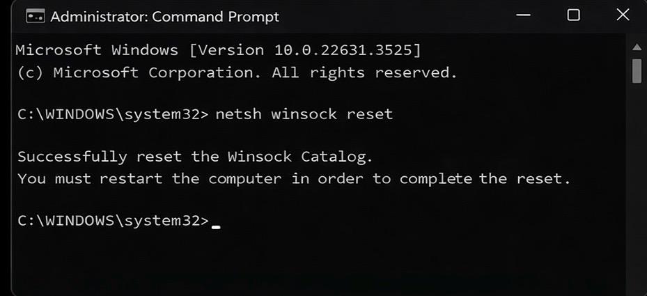 • Type the command netsh winsock reset and press Enter