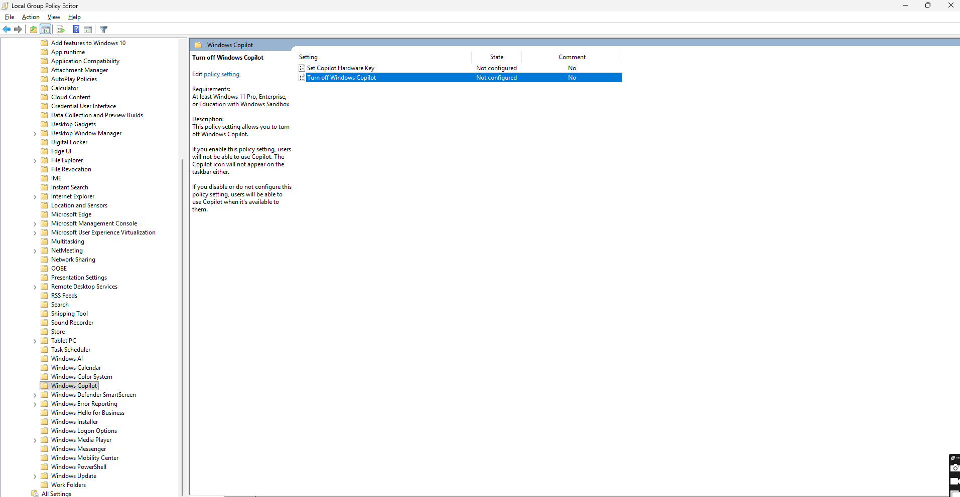 For Windows 11 users who have Enterprise, Education, or Pro versions, the Group Editor offers a more thorough option to disable Copilot.